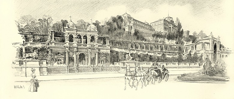 Work on the castle began in 1875 and was intended primarily to enable the accommodation of a substantial administrative apparatus required as a result of the Compromise. In order to harmonize the alteration work with the expansions to the palace under Maria Theresia in around 1760, the part of the building constructed at that time was copied and set against the original like a mirror image. Architect Miklós Ybl was in charge of the work, a representative of European historicism who also designed the Budapest Opera House. Following his death in 1891, Alajos Hauszmann took over direction of the works on the castle and shaped its neo-Baroque appearance.
