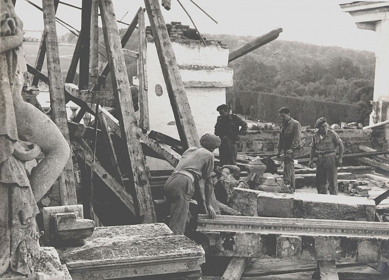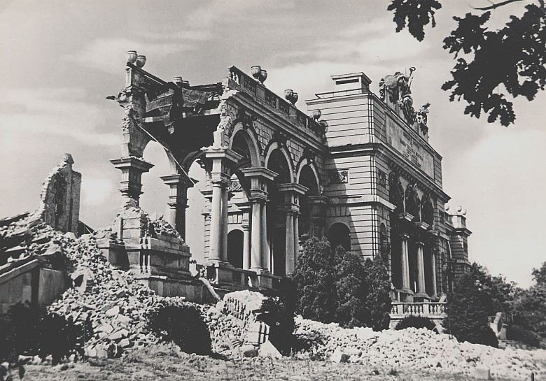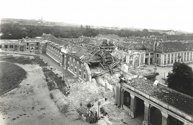 During the Second World War parts of the palace were used by units belonging to the National Socialist security and military police; nevertheless, the state rooms could be viewed until the autumn of 1943. Eventually however, the threat of aerial bombardment led to a number of particularly valuable items being taken to safety and stored in a salt mine. On 19 February 1945 the main building took a direct hit. A hail of broken window panes and roof tiles rained down, and a large hole yawned in the roof of the central wing. The décor of the Great Gallery was partially damaged by the impact, but luckily no fires broke out. The main building came off relatively lightly, as after the raids were over, a total of 269 impacts were recorded which had caused severe damage to the ancillary buildings and the park.