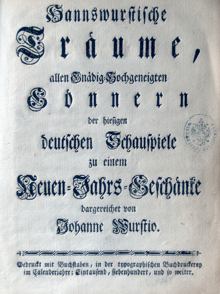 This work was written during the course of the Vienna ‘Hanswurst controversy’ (1747–1783) in which Joseph von Sonnenfels (1732–1817) waged a campaign against popular theatre and the slapstick extemporizing figure of Hanswurst. Philipp Hafner, a major author of traditional Viennese popular comedies, defended the figure but urged the qualitative improvement of popular theatre. In his satirical pamphlet Hannswurstische Traeume from 1763 he attempted to mediate between the two opposing parties.