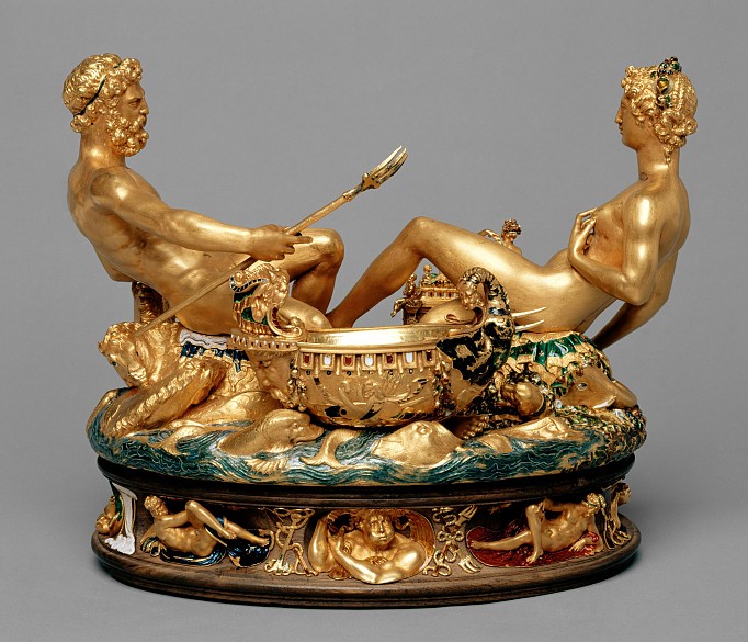The Saliera, of rolled gold, was created by Cellini for Francis I of France between 1540 and 1543. From his descendant Charles IX it passed to Archduke Ferdinand II. The saltcellar shows an allegory of the Earth and the interplay of land and sea. Its right side has a man with a trident and a ship symbolizing water, while its left side has a woman representing the Earth. The base depicts the winds, the times of day and human activities.