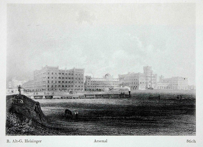 Auf einem Grundstück nahe dem heutigen Südbahnhof im dritten Wiener Gemeindebezirk wurden schließlich in den Jahren 1849 bis 1856 zahlreiche Backsteinbauten im Geist des romantischen Historismus mit italianisierenden, byzantinischen und mittelalterlichen Formen errichtet. Das Arsenal war damit die erste Anlage des Festungsdreiecks, das die alte Wiener Stadtmauer ablösen sollte; die Rossauer-Kaserne und die heute nicht mehr existierende Franz-Joseph-Kaserne am Stubenring folgten. Die Schlusssteinlegung des Arsenalkomplexes erfolgte am 8. Mai 1856 in einer feierlichen Zeremonie, an der Kaiser Franz Joseph und seine Frau Elisabeth teilnahmen.