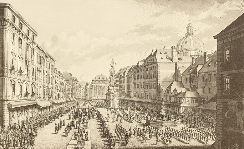 Angeführt wurde der Zug von drei Priestern, denen eine Abordnung von Hofbediensteten folgte. Danach schritten die Hofgeistlichkeit in vollem Ornat sowie die Hof- und Staatswürdenträger in Gala, darunter nach Rang geordnet die Geheimen Räte und Minister, und schließlich die Erzherzoge einher.