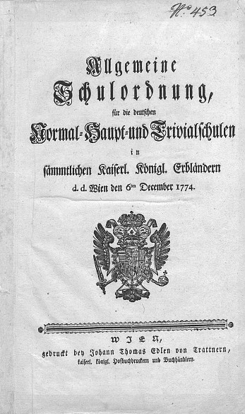 Die „Allgemeine Schulordnung für die deutschen Normal-, Haupt- und Trivialschulen in sämmtlichen Kayserl. Königl. Erbländern“ von 1774 hatte die Bildung von Kindern beiderlei Geschlechts als wichtigste Grundlage für die „wahre Glückseligkeit der Nationen“ zum Ziel. Eine sechsjährige Schulpflicht wurde eingeführt. Das Gesetz von 1774 brachte eine Vereinheitlichung des Schulwesens durch Schulbücher, eine starke Kontrolle durch geistliche und weltliche Schulaufsichtsorgane, aber auch eine Bürokratisierung und Hierarchisierung dieses Bereichs mit sich. Auswendiglernen, Buchstabieren und Katechisieren waren die bevorzugten Lehrmethoden.