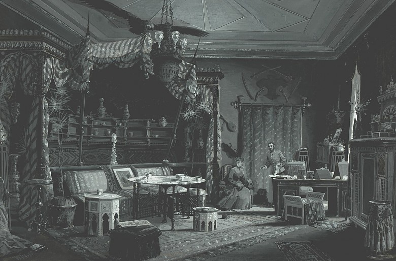 „Allgemeine Illustrierte Zeitung“, 1886.In den übrigen Staats- und Prunkgemächern kann ein Gefühl der Behaglichkeit nicht aufkommen; man hat nicht die Empfindung, dass sie bewohnt seien. […] Anders das Arbeitszimmer. Da ist das wirkliche Heim des Kronprinzen […]. Aus der ganzen Einrichtung mit den hundert Kleinigkeiten, die selbst den prächtigsten Raum erst wohnlich machen, spricht ein edles Schönheitsgefühl. […] Überhaupt bilden orientalische Teppiche den wichtigsten und schönsten Bestandtheil der ganzen Einrichtung. […] In der linken Ecke des Zimmers ist eine Galerie mit einer Balustrade und Banksitzen, über welche persische Teppiche gebreitet sind, angebracht. Die zeltartige Ueberdachung wird von den Krallen eines kolossalen Adlers […] zusammengehalten. Auf dem Divan bilden zwei große, als Eselstaschen montierte Kissen die Rückenlehne. Vor dem Divan steht ein arabischer Rauchtisch mit einer großen, massiv silbernen, kunstreich gravierten Platte und um den Tisch sind mehrere türkische Tabourets mit Silber-, Elfenbein- und Perlmuttintarsien gestellt. […] An der Wand zwischen den beiden Fenstern steht ein orientalischer Schrank mit allerlei Rauchutensilien.