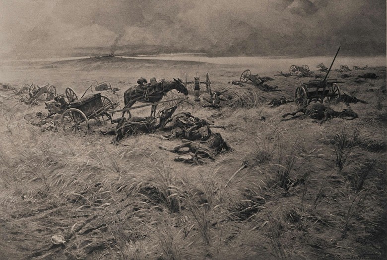 Das Gemälde zeigt die vernichtenden Auswirkungen am Abend der Schlacht. Ähnlich wie wenige Jahre zuvor in Solferino forderte die Schlacht von Königgrätz zahlreiche Tote und Verwundete, sie war eine der verlustreichsten und blutigsten Schlachten des 19. Jahrhunderts. Die österreichische Taktik, die so genannte Stoßtaktik – ein sehr schnelles Vorrücken der Soldaten in Richtung der Gegner –, schlug völlig fehl: 220.000 preußische Soldaten ließen 215.000 dicht gedrängte Angehörige der habsburgischen Armee herankommen, ehe sie das Feuer eröffneten. Die Verluste waren fatal: Preußen hatte 9.000 Verwundete, Vermisste, Gefangene und Getötete zu beklagen, die Österreicher ein Vielfaches, nämlich 42.000. Insgesamt fanden über 7.000 Soldaten in dieser Schlacht den Tod.