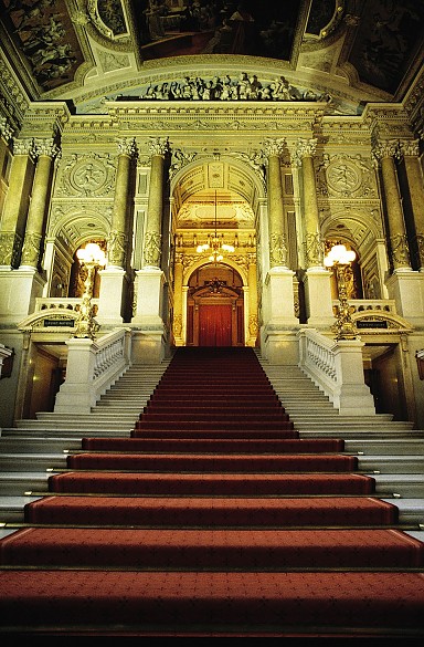 Das Theater wurde pompös ausgestattet. Die Deckengemälde in den beiden Stiegenhäusern malte der damals 24-jährige Gustav Klimt gemeinsam mit seinem jüngeren Bruder Ernst und seinem Akademiekollegen Franz Matsch. Die drei jungen Künstler hatten sich zur Künstlerkompanie zusammengeschlossen und bereits mehrere Theaterdekorationen in den Kronländern ausgeführt. Nun konnten sie erstmals in der Haupt- und Residenzstadt, noch dazu an allerprominentester Stelle, ihr Können zeigen.