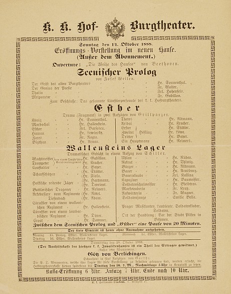 Der Schauspieler Hugo Thimig (1854–1844) über das Burgtheater am Ring.Wir sitzen nun unrettbar fest in der neuen prunkvollen Gruft unseres Burgtheaters und sehen, qualvoll geängstigt, die Lebendigbegrabenen, wie man das alte liebe Haus am Michaelerplatze langsam und erbarmungslos einreißt. Wir werden noch eine kurze Zeit an unserem alten Ruhm zehren, und dann wird der Fluch des neuen Riesentheaters alle unsere guten Traditionen vernichtet haben.