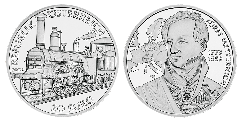 Als "großer österreichischer Staatsmann" wird Fürst Metternich im Beitext zur 20-Euro-Sondergedenkmünze "Die Biedermeierzeit" bezeichnet, die 2003 von der Münze Österreich herausgegeben wurde. Diese durchaus positive Charakterisierung des prägenden europäischen Politikers der ersten Hälfte des 19. Jahrhunderts verschweigt jedoch die Schattenseiten seiner Zeit als Staatskanzler, als er der eigentlich mächtige Mann der Habsburgermonarchie war.