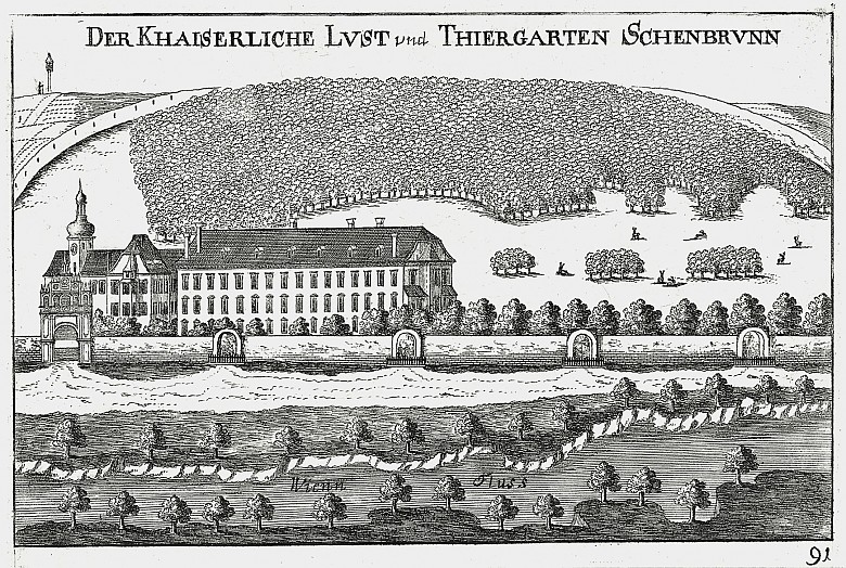 Zitiert nach Iby, Elfriede/Koller, Alexander: Schönbrunn, Wien 2000, S. 42Beschreibung des Schlosses Schönbrunn aus dem Jahre 1660: [...] so auf Italienische Manier angeleget, von dreyen Geschoß hoch gebauet, und von Gemälden und anderen noch ziemlich mobilirt war. Aus dem Hause fuhren Wir zu dem Brunn, von dem der Ort den Nahmen hat [...] auch sonsten die Quelle gar schön gefasset war [...].