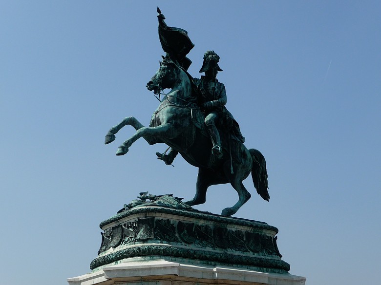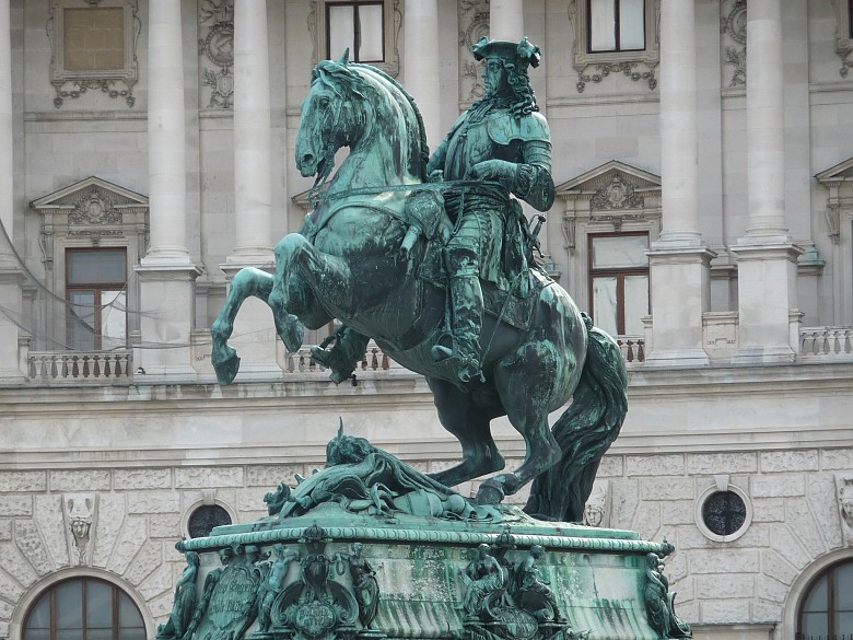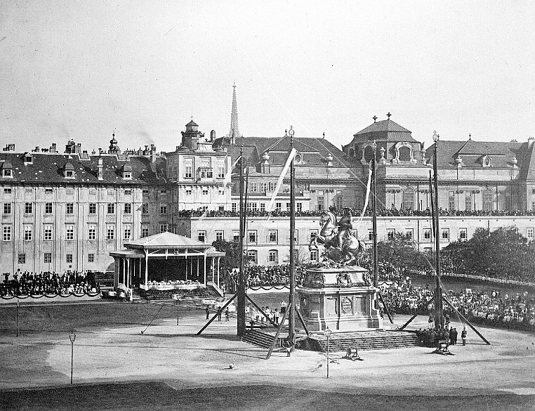 Auch die Enthüllung des auf der gegenüberliegenden Seite des Platzes errichteten Denkmals des Prinzen Eugen im Jahr 1865 stand unter keinem guten Stern: Der Konflikt mit Preußen um Schleswig-Holstein näherte sich gerade seinem Höhepunkt. Prinz Eugen von Savoyen, der Prototyp des siegreichen habsburgischen Feldherrn und Bezwinger der Türken, sollte das Haus Österreich als Verteidiger des christlichen Glaubens gegen die muslimischen Türken verkörpern. Gleichzeitig sollte das Reiterstandbild die Ungarn daran erinnern, dass erst durch den Prinzen Eugen und die habsburgischen Armeen die lange währende osmanische Bedrohung für Ungarn beendet worden war.