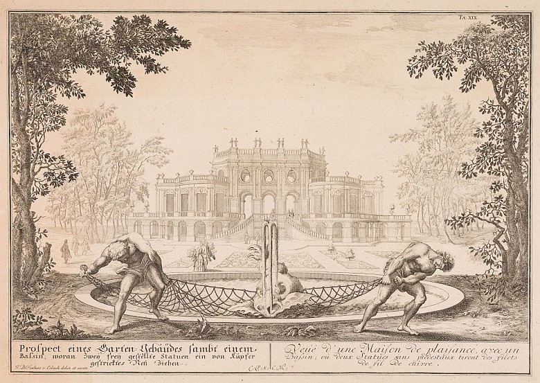 Originaltitel: Prospect eines Garten-Gebäudes sambt einem Bassin, woran zwey gestellte Statuen ein von Kupfer gestricktes Netz ziehen