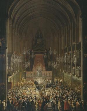 Das Bild gehört zum Zyklus der Hochzeitsbilder, in denen die Feierlichkeiten anläßlich der Hochzeit von Joseph II. mit Isabella von Bourbon-Parma im Jahre 1760 festgehalten wurden.