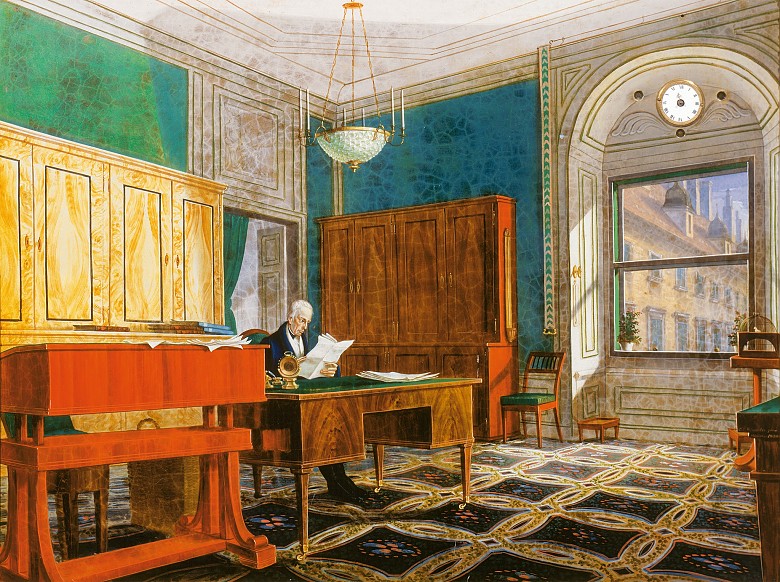 Bilderuhr mit Franz II./I. – Ein Teppich aus der Linz war im Arbeitszimmer ausgelegt