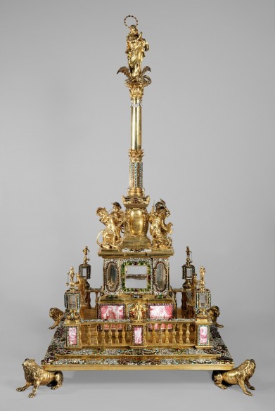 Die Marienverehrung war eines der Hauptelemente der "Pietas Austriaca", der in der Barockzeit zur Haupttugend der Dynastie stilisierten Frömmigkeit der Habsburger. 1645 gelobte Kaiser Ferdinand III. angesichts der drohenden Gefahr durch die heranrückenden Schweden eine Mariensäule am Platz "Am Hof" in Wien zu errichten. Diese wurde 1667 durch die noch heute dort befindliche Säule aus Bronzeguss ersetzt. In den Jahren 1675-1678 ließ Leopold I. vom Augsburger Goldschmied Philipp Küsel eine 129 cm hohe Nachbildung aus vergoldetem Silber anfertigen, die mit über 3.000 Edelsteinen und Perlen besetzt sowie mit Emailmalerei verziert ist.