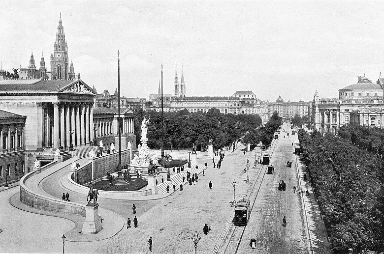 Eine Straße, gesäumt von Parks und repräsentativen Bauten, wird um die Wiener Innenstadt gelegt. Sie bildet den Laufsteg der neuen Haute volée: Das Großbürgertum der Monarchie verewigt sich in repräsentativen Palais nahe der kaiserlichen Hofburg, üppig im Stil des Historismus ausgestattet, und gibt sich ein Stelldichein beim Lustwandeln am Korso, im Kaffeehaus und im Grand Hotel. Ein historischer Festzug, gestaltet von Hans Makart, dem "Malerfürsten" und Idol der Ringstraßengesellschaft, macht die Ringstraße zu dem, wofür sie berühmt wurde: zur Flaniermeile der WienerInnen, einem Ort der Repräsentation, der Zurschaustellung, des Sehens und Gesehenwerdens. Der Ring bot für jedermann die Gelegenheit, an der Welt der Reichen und Schönen teilzunehmen, wenn auch nur einen Spaziergang lang.