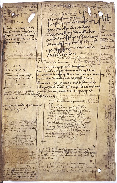 In the notebook we can read in Frederick’s own hand that all the artworks and liturgical items he owned and the building projects he had initiated were to be marked with the vowel sequence (together with a framing loop). Another entry in the notebook (albeit in another hand) purports to divine the meaning of the device as ‘Alles Erdreich ist Österreich untertan’ (All the earth is subject to Austria), or the Latin version: ‘Austriae est imperare orbi universo’. Thus everyone thought the authentic interpretation had been found.