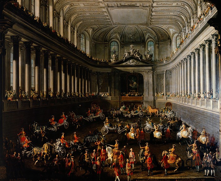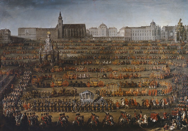 A seemingly unending parade of splendid coaches, horsemen and lackeys winds its way towards an urban panorama in the background: the grand entrée of Isabella of Parma into Vienna in October 1760 was the culmination of her bridal journey to meet her husband-to-be, Archduke Joseph. The later emperor Joseph II was married to the Bourbon princess for political reasons, and this new alliance with a former arch-enemy had to be staged with the greatest possible degree of pageantry and pomp. In order to ensure that this grand event endured in the memory of all the courtiers, ambassadors and aristocrats, Maria Theresa’s court artist Martin van Meytens was commissioned to document the festivities in a series of five monumental paintings known as the Wedding Cycle which depicts various stages of the nuptial festivities with almost documentary precision. It shows the hierarchy of court society, the imperial family at the banqueting table and the magnificent appointments of the rooms. Contemporary written records confirm that this is a more or less accurate depiction of how it looked.