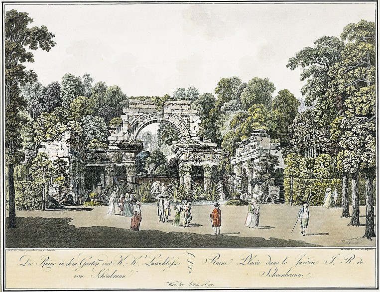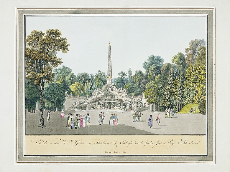 At first one’s gaze is drawn towards the Gloriette, which crowns Schönbrunn Hill as a triumphal arch commemorating the victorious Habsburg armies. The lay-out of the hill was one of the major problems of the gardens at Schönbrunn in the eyes of horticultural designers, as it contradicted the principles of the Baroque garden, which was supposed to flow unhindered into the infinite distance of the landscape. The architect Johann Ferdinand Hetzendorf von Hohenberg had originally planned to enliven the slope with numerous waterworks, fountains and cascades. This elaborate design was eventually realized in a severely reduced form – a not uncommon outcome of Habsburg projects. The erection of the Gloriette as a counterpoint to the palace provided the main axis of the gardens with a terminating point de vue.