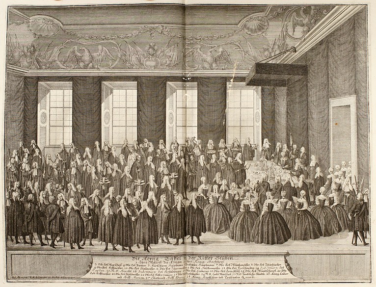 The procession made its way first to St Stephen’s Cathedral, where High Mass was celebrated. From there it went to the Hofburg, where the actual act of homage and the swearing of the oath of allegiance took place in the ‘Ritterstube’ (Knights’ Room) of the ceremonial apartments. This was followed by a thanksgiving service in the Hofburg Chapel, and a Court banquet at which the archducal coronet was placed next to the ruler on a table of its own as the symbol of his office.