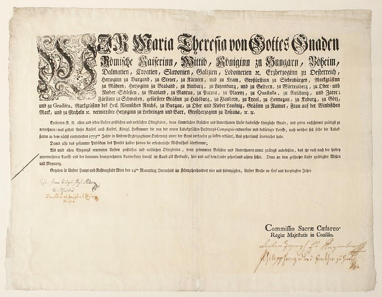 ‘Everything for the people, nothing by the people’: this well-known pronouncement, attributed to Joseph II, sums up the aim of mercantilist policy. The absolute monarchs were supposed to ensure the happiness and welfare of the people living in the Habsburg territories, who in their turn had to be the ‘implementing tools’ of the interests of rulers and state. However, ‘happiness’ was not a matter of the needs or the happiness of individuals but of the well-being of the state, embodied in the sovereign. In order to create this well-being, Maria Theresa had a number of administrative, economic and financial reforms carried out. These included new customs regulations and a re-organization of the tax system.