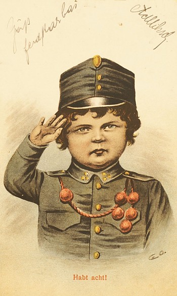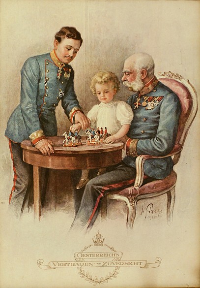 The old Emperor Franz Joseph, his successor Karl and the young Archduke Otto having fun playing with tin soldiers – in the First World War, however, the lithograph’s image of a harmless family idyll was for innumerable men and women to become the experience of war in all its grim reality. When Franz Joseph died in the middle of the First World War in November 1916, he was succeeded as Emperor of Austria by his great-nephew Karl, who was to be Austria’s last Habsburg ruler. Politically entirely inexperienced, Karl did not play a leading role in the world war – in the question of the nationalities, for instance, he had little scope for action. His attempts at diplomatic mediation proved unsuccessful, particular famous among them being the so-called Sixtus Affair in which Sixtus and Xavier, two of his wife Zita’s brothers, acted as go-betweens in secret peace negotiations with France. In a letter to Sixtus, Karl committed himself to supporting French territorial claims in Alsace-Lorraine, but his secret endeavours failed. This ‘affair’ became embarrassing when early in 1918 the letter to Sixtus was published by France and Karl adamantly denied that he had engaged in the negotiations at all. Consequently, Austria finally subordinated itself to the war policy of Kaiser Wilhelm II.