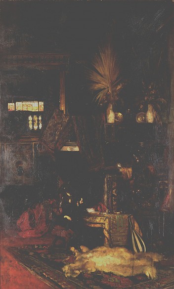 In his studio with its oriental décor illustrious guests dressed in historical costumes participated in glittering celebrations. Makart’s extravagant lifestyle seized the city’s imagination: a rose was bred and named after him, ladies vied with one another to copy the artistic costumes and feathered hats in his paintings. His studio became a place of pilgrimage that could be viewed daily upon payment of an admission charge and thus became the model on which the décor of many an upper middle-class drawing room was based.