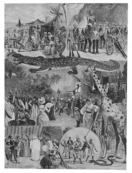 Makart’s lifestyle had a considerable influence not only on the upper middle classes but also on his fellow-artists. The Vienna Künstlerhaus (the exhibition building of the Austrian Society of Artists) held balls in historical costume on the model of the legendary parties held in his studio. Social events had been held there regularly since 1870. The climax of the year was the Fest der Künstler, a party held during Carnival time for artists and their friends, which had a different theme each year. These festivities were mostly parodistic in intent. The organisers caricatured their own work or their fellow-artists, as for example at the ball held in 1901, which parodied the exhibitions and the art of the Secession, the group of artists which had broken away from the Künstlerhaus. With elaborate decorations including illusionistic paintings which could be admired for a week following the event for a small charge, the party created a world of illusion. The 1885 Carnival party had an African theme – one of the decorations was a crocodile with scales made of green enamel saucepan lids.