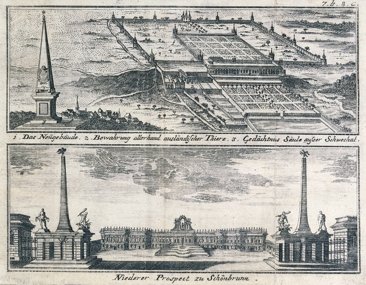 The main building, which was to house Maximilian’s collections, sat on the edge of a terrain with sweeping views of the wetland forests along the Danube. Between the latter and the gardens was a fenced-in game reserve, forming the transition to open countryside. Immediately surrounding the palace was a pleasance with fountains, grottoes and arcaded walkways where rarities such as tulips, lilac and the potato plant grew and exotic animals – brought to Vienna to satisfy the emperor’s scientific curiosity – could be marvelled at.