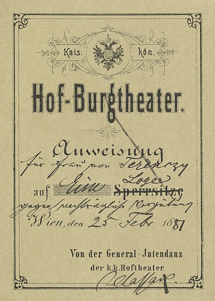 During the eighteen years of his management, the thrifty Laube made ‘not even a penny deficit’. Franz Joseph financed the theatre from his privy purse – all new actors joining the ensemble had to present themselves personally to the Emperor before taking up their engagement. He himself was fond of the theatre. Nonetheless, as he grew older he found it became an increasingly tedious official chore. Eventually he confined his interests solely to questions of theatre administration – and to his relationship with court actress Katharina Schratt.