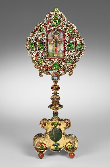 The Habsburgs’ cult of the Cross had several sources that attest to a tradition going back to late Antiquity and early Christianity. At the Battle of the Milvian Bridge victory under the sign of the Christian cross is supposed to have been prophesied to Emperor Constantine the Great (‘in hoc signo vinces’ – ‘thou shalt be victorious under this standard!’). Thus the veneration of the Cross also played a central role in the insignia of the Holy Roman Empire, for instance in the reliquary of the Cross, said to contain a piece of the Cross of Christ, or the sacred Lance, likewise associated with the Crucifixion, which bears a nail that according to legend was used to crucify Christ.