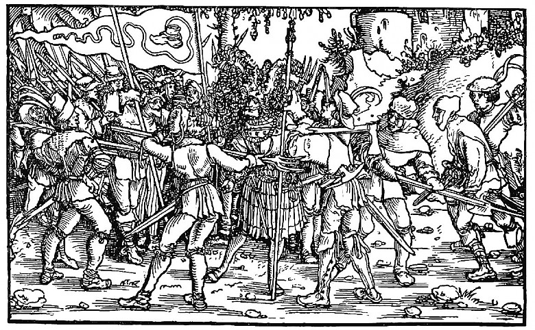 The Bundschuh, the usual laced footwear of the medieval peasant farmer, came to be the symbol of peasant uprisings. In the southern German area the Bundschuh movement started as early as 1493-1517. These loosely-linked localized uprisings were bloodily supressed. As a symbol of their common cause in revolt against their feudal overlords, they continued to bear banners displaying the Bundschuh in the ensuing Peasant Wars.