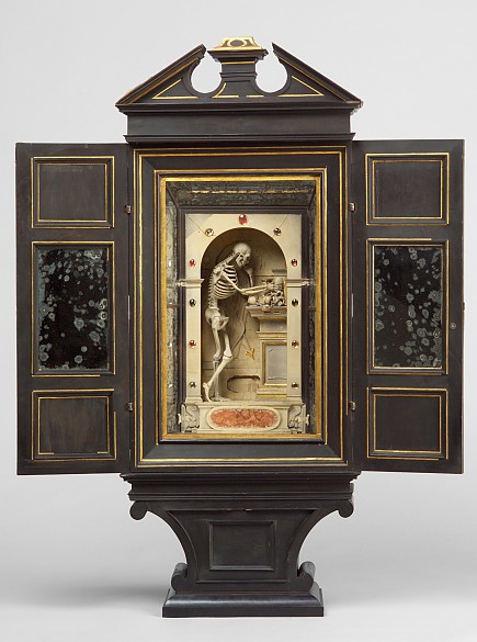 The Tödlein-Schrein (Shrine of Little Death) demonstrates the interest in human anatomy that grew during the Renaissance. It contains an accurately worked skeleton executed after the depictions in Andreas Vesalius’ influential work of anatomy De humani corporis fabrica. The shrine presents a mixture of various vanitas motifs symbolizing the transience of earthly life: for example an hour-glass or a mirror, the latter thus including the onlooker in the message of the piece.