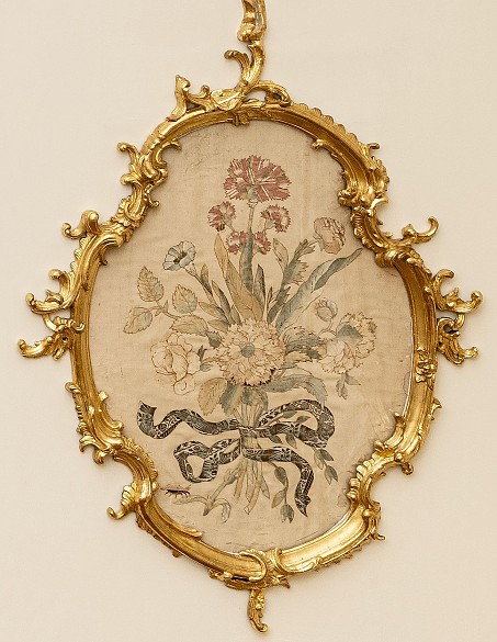 Composed of colorful silk ribbons, an individually assembled textile bouquet was created. Framed and fitted into the wall paneling, these detailed works represent Maria Theresa's personal taste.